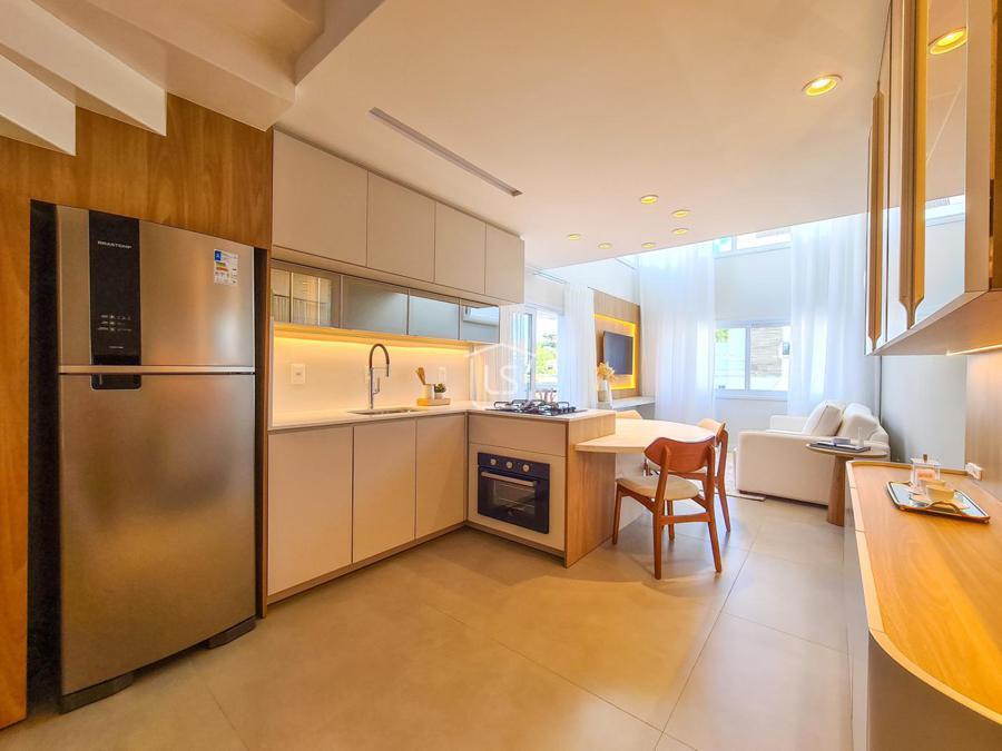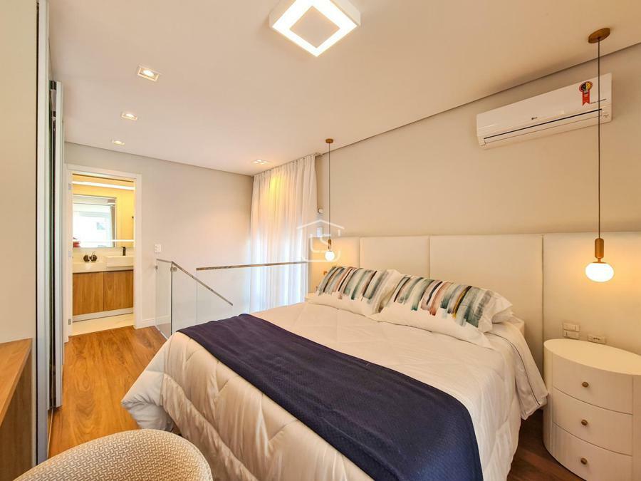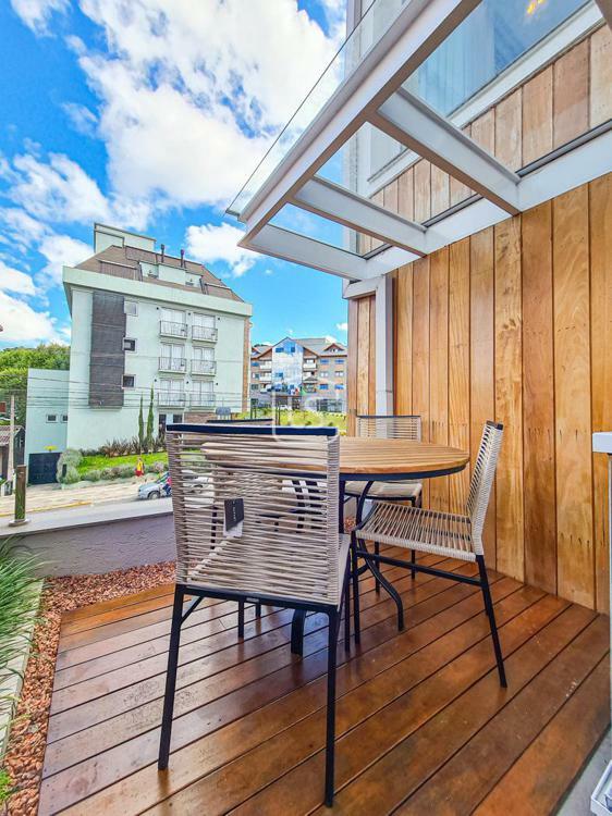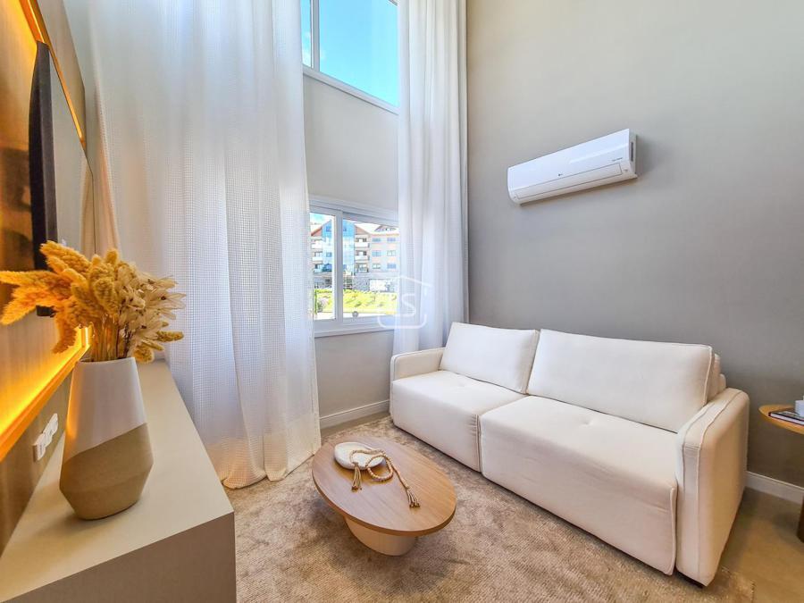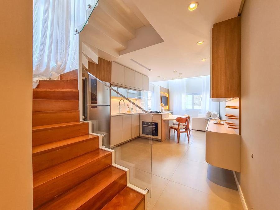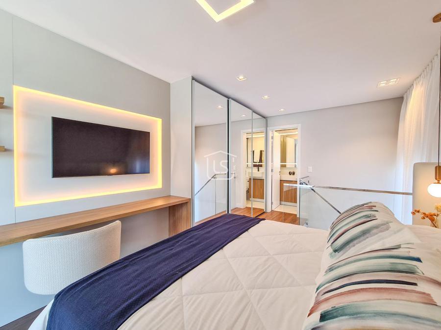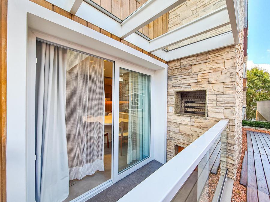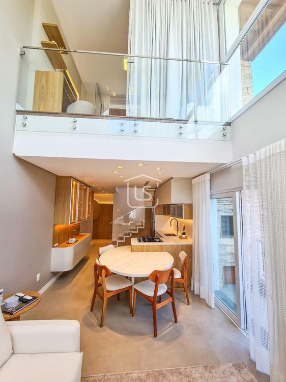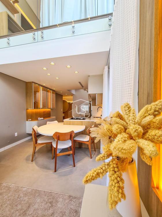 Belíssimo loft, NOVO, nunca habitado, mobiliado e decorado, distribuído em 1 suíte, living dois ambientes com lareira e sacada com churrasqueira, cozinha americana e lavabo.