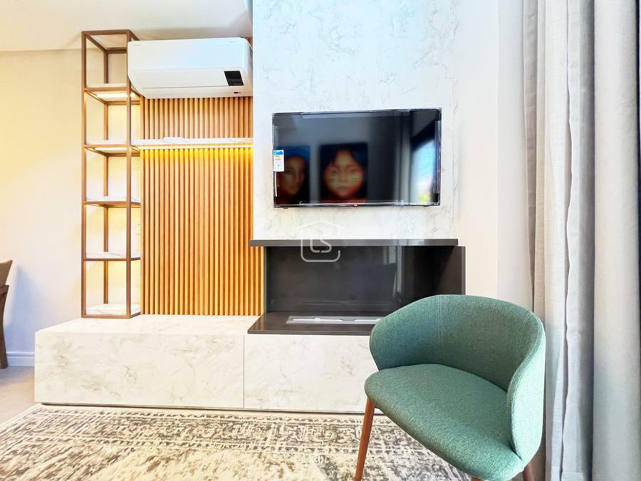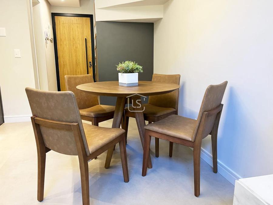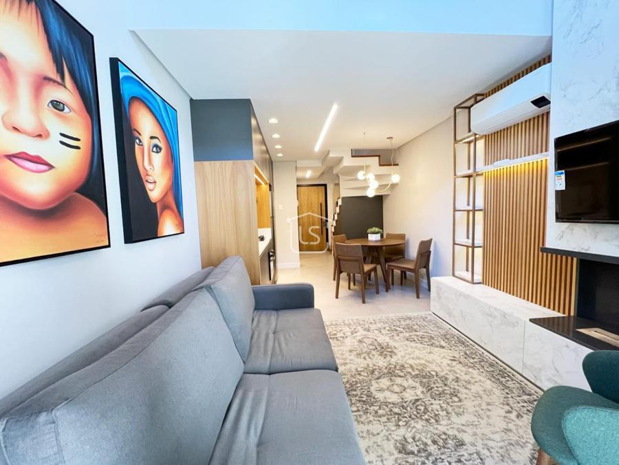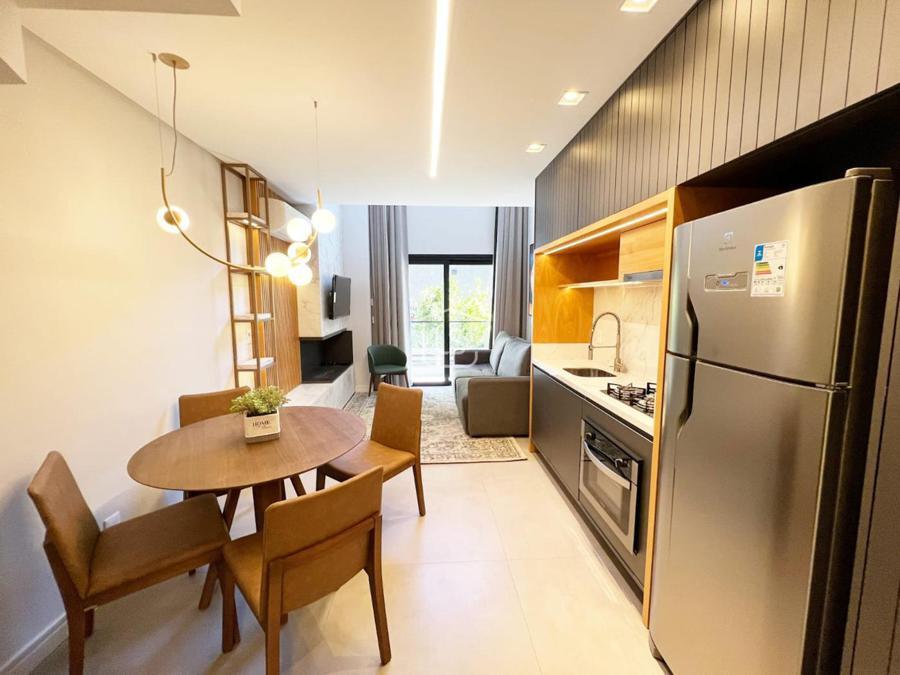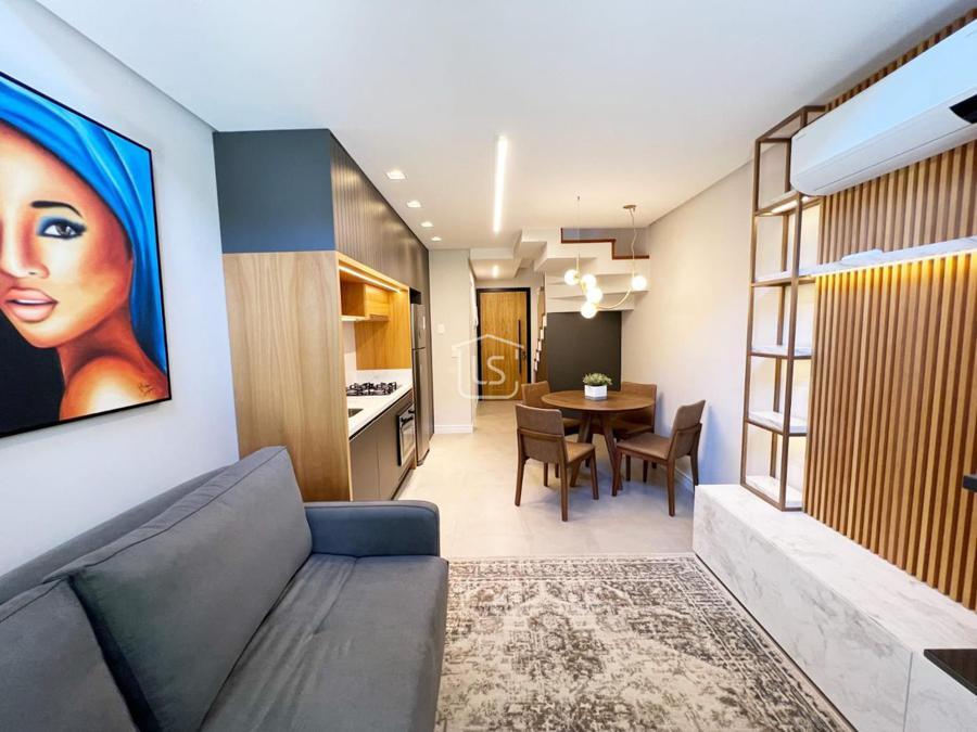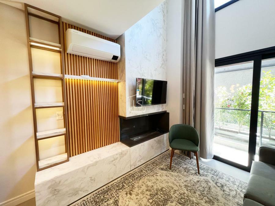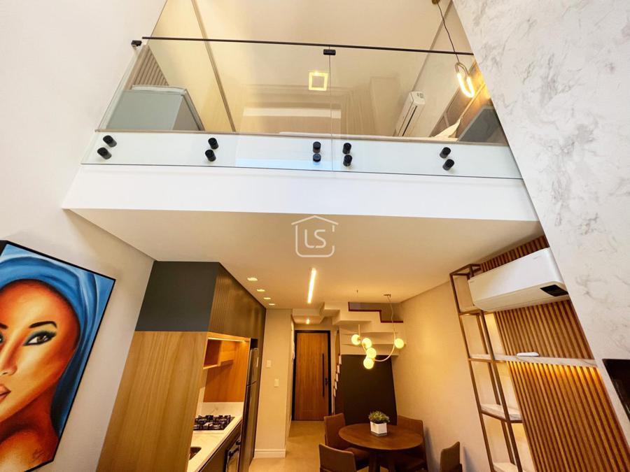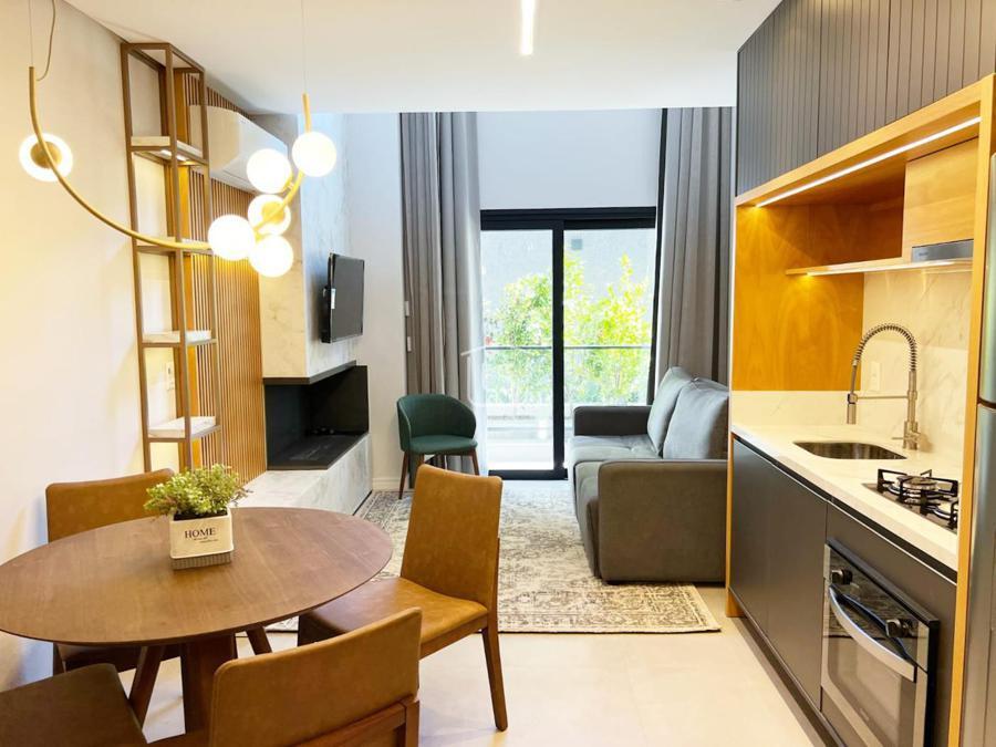 Apartamento estilo loft, totalmente mobiliado, distribuído em 1 suíte, amplo living dois ambientes com lareira, cozinha e lavabo.