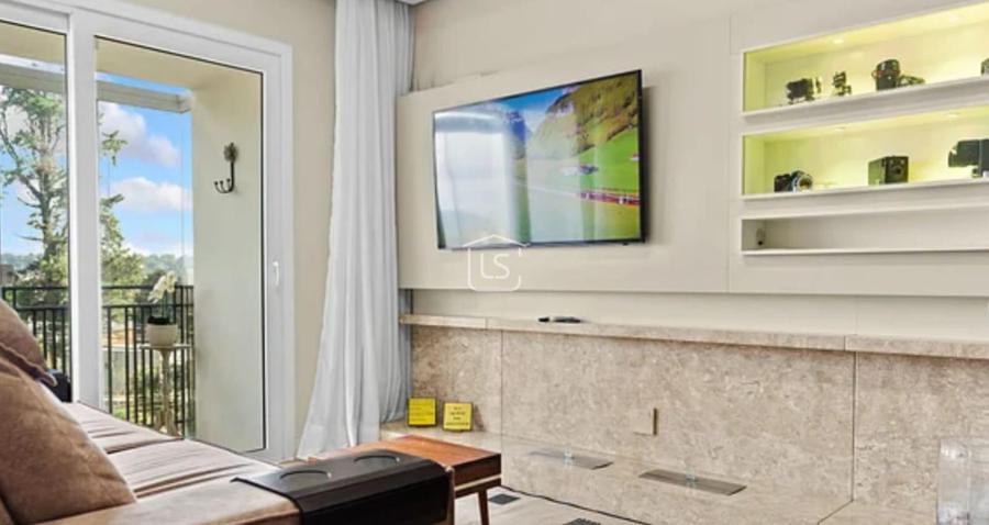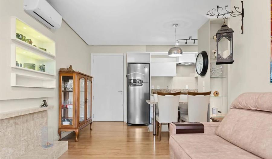 Distribuído em living dois ambientes com sacada fechada e lareira ecológica.