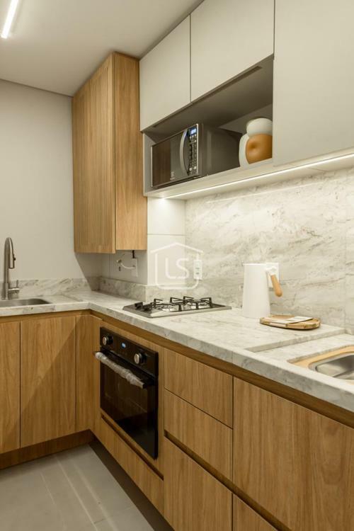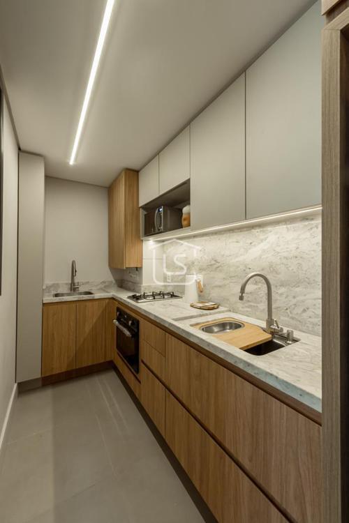 Cozinha e área de serviço integradas com churrasqueira.