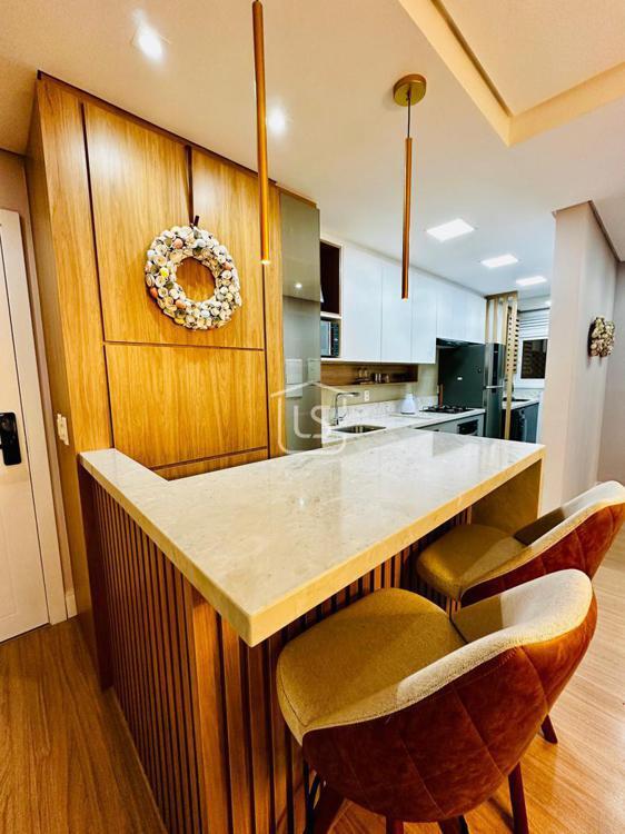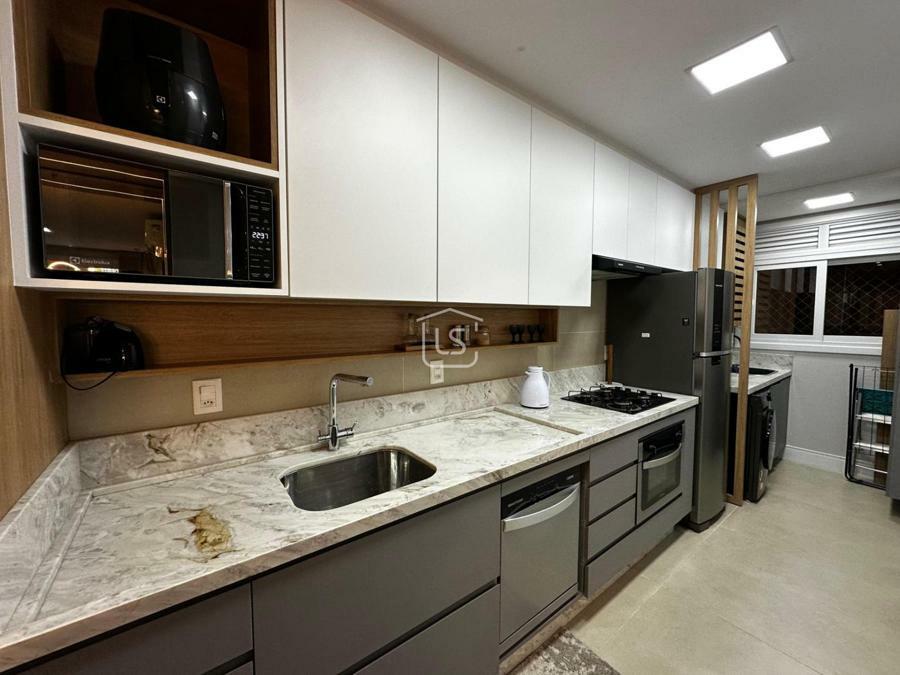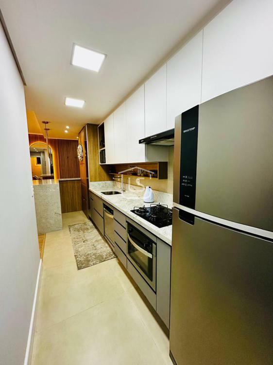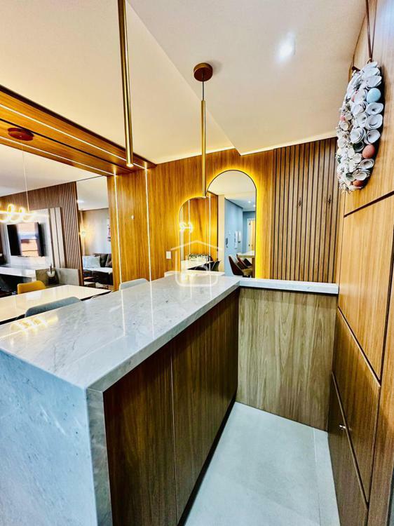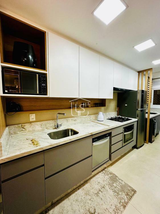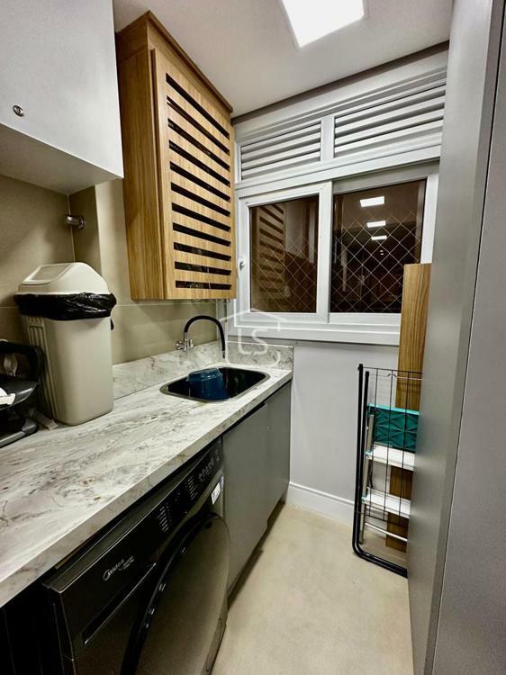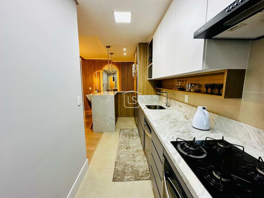 Cozinha americana com churrasqueira e área de serviço integrada.