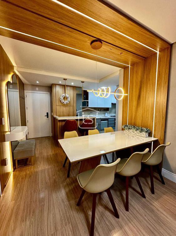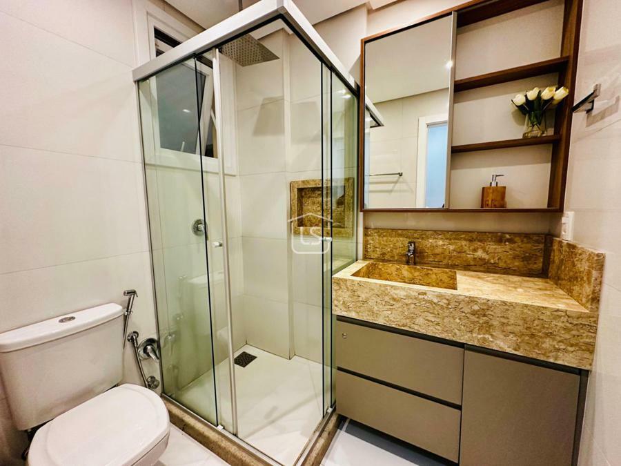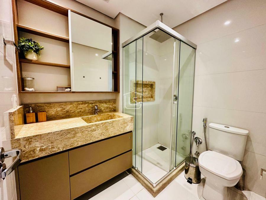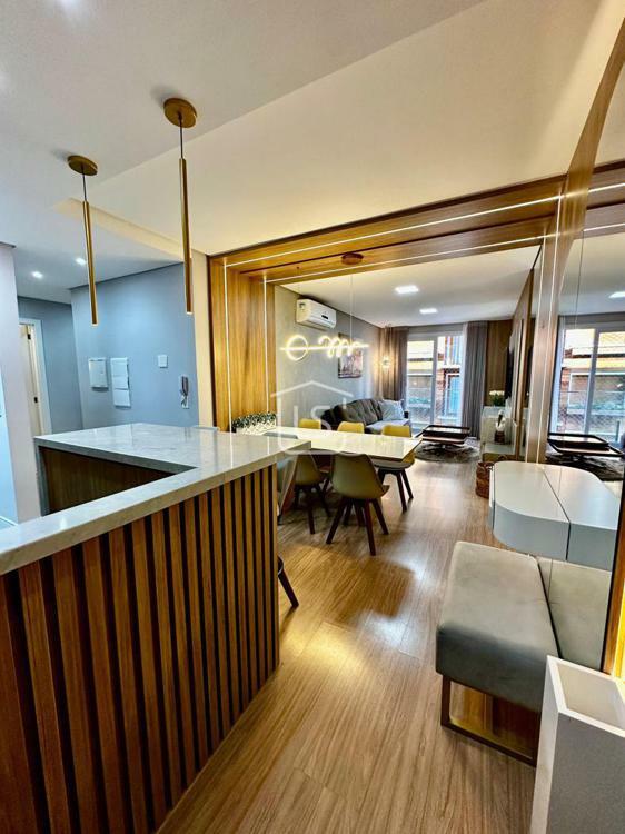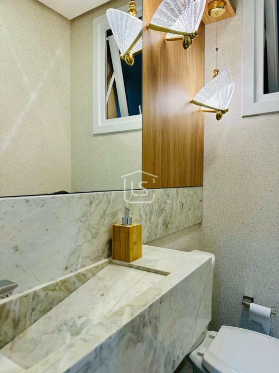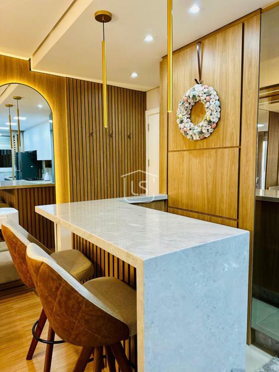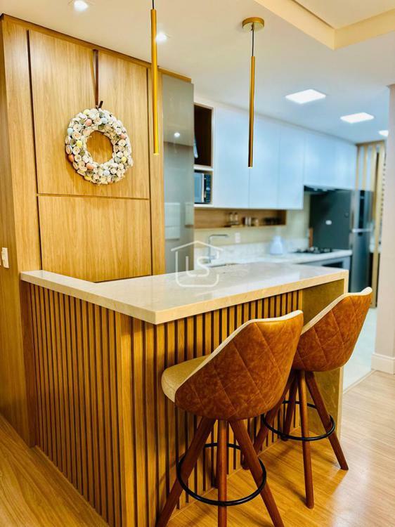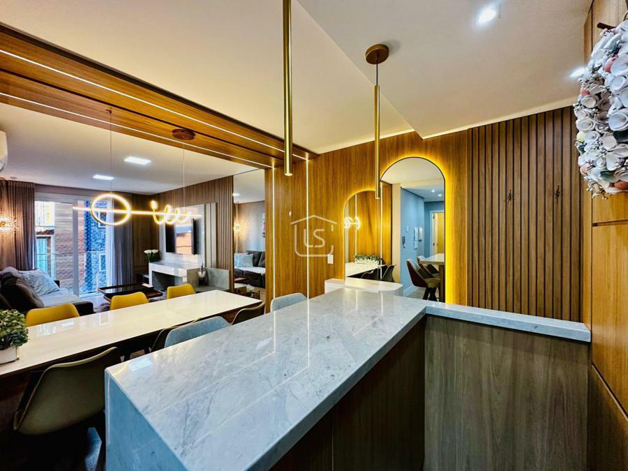 Cozinha americana com churrasqueira e área de serviço integrada.