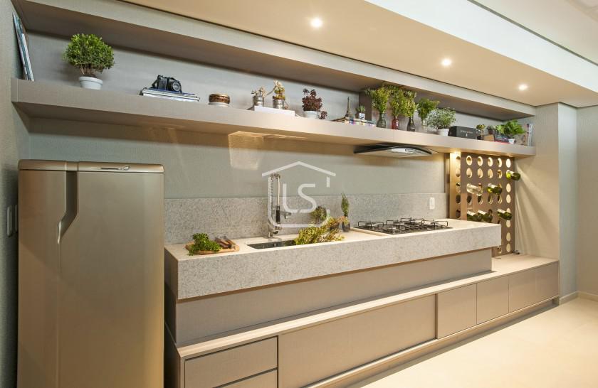 Distribuído em 2 suítes, amplo living dois ambientes, cozinha americana com churrasqueira e área de serviço integrada. Lavabo e vaga coberta de garagem.