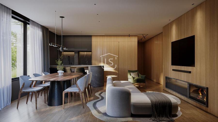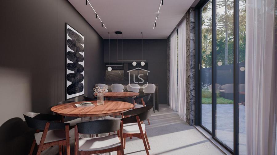 Espaço gourmet com churrasqueira, sala de estar e jantar integradas.