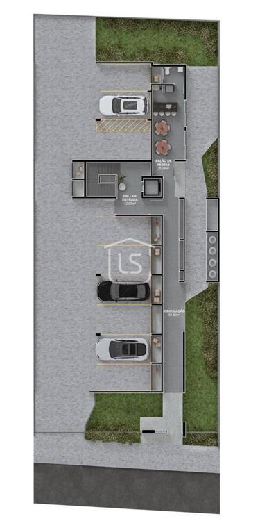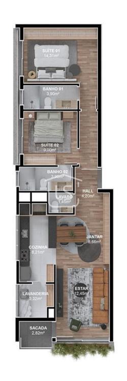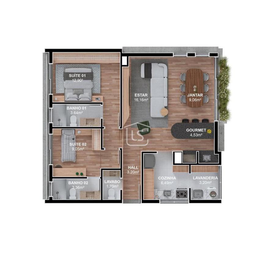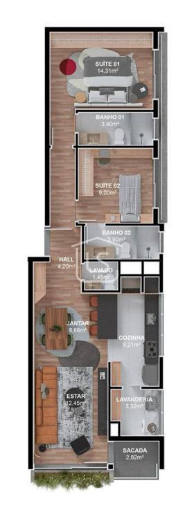 Apartamento com 90,41 m², distribuído em cozinha fechada e área de serviço.