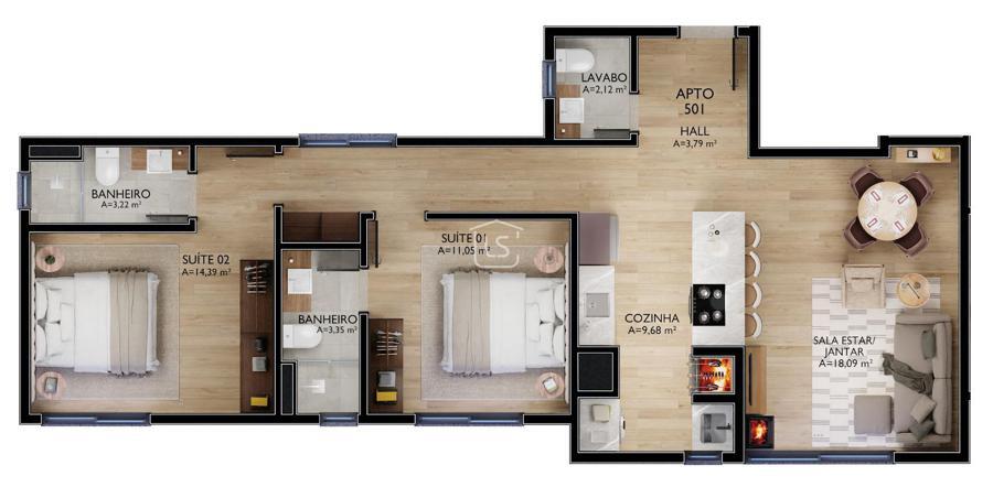 Apartamentos com 2 suítes, amplos e funcionais.