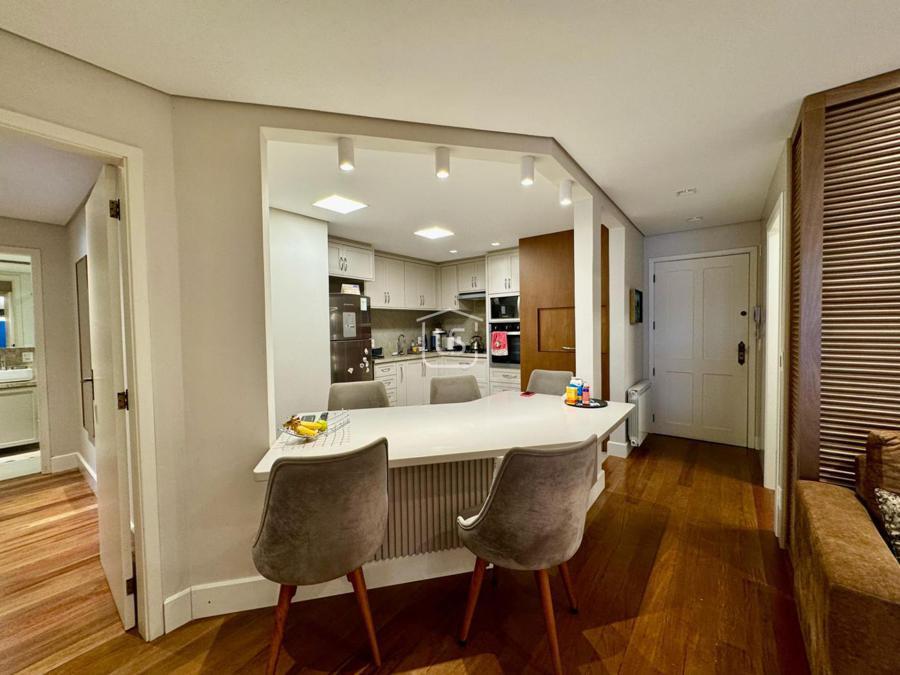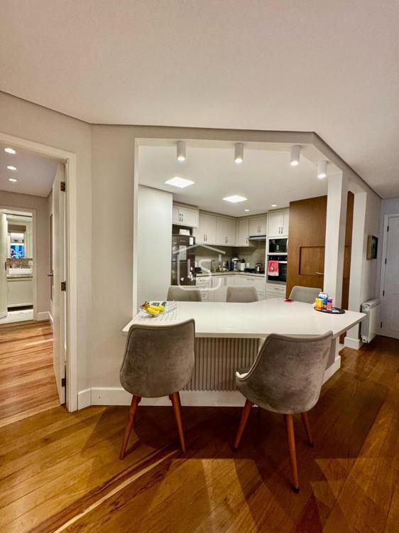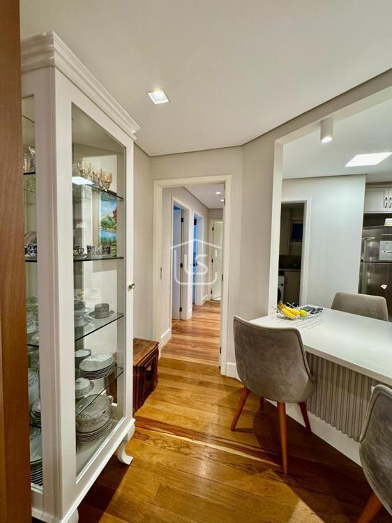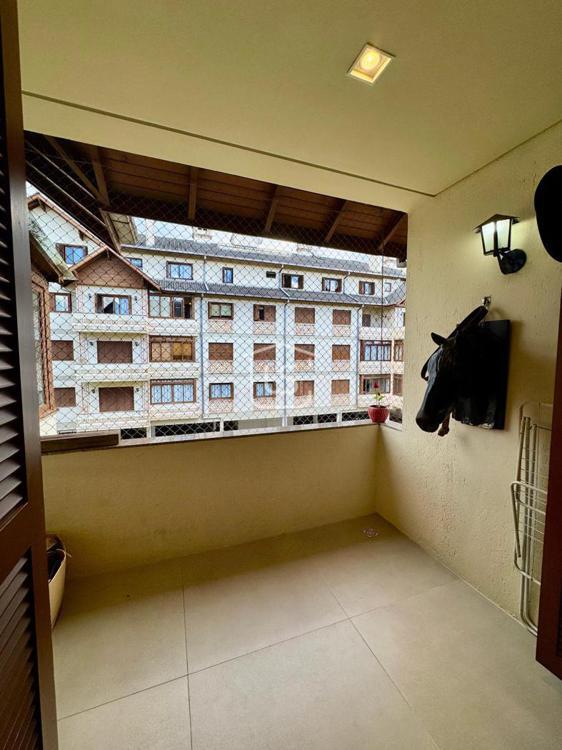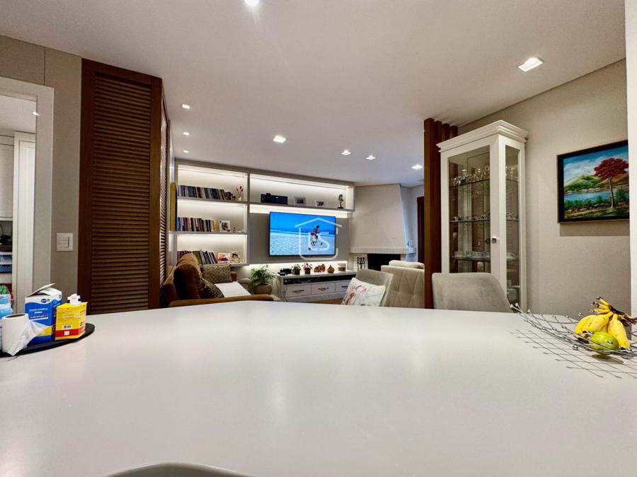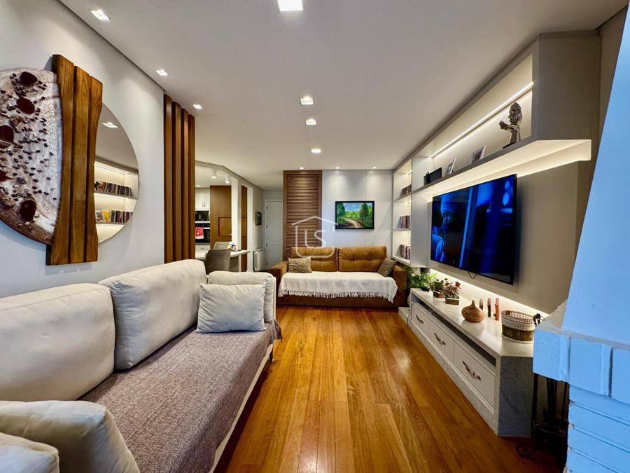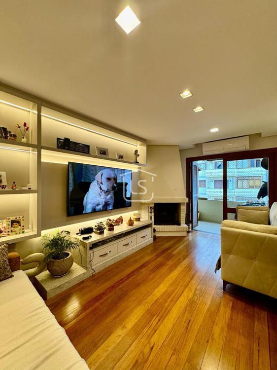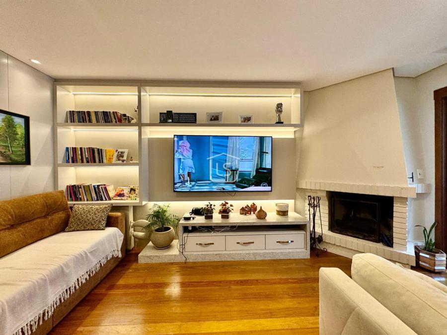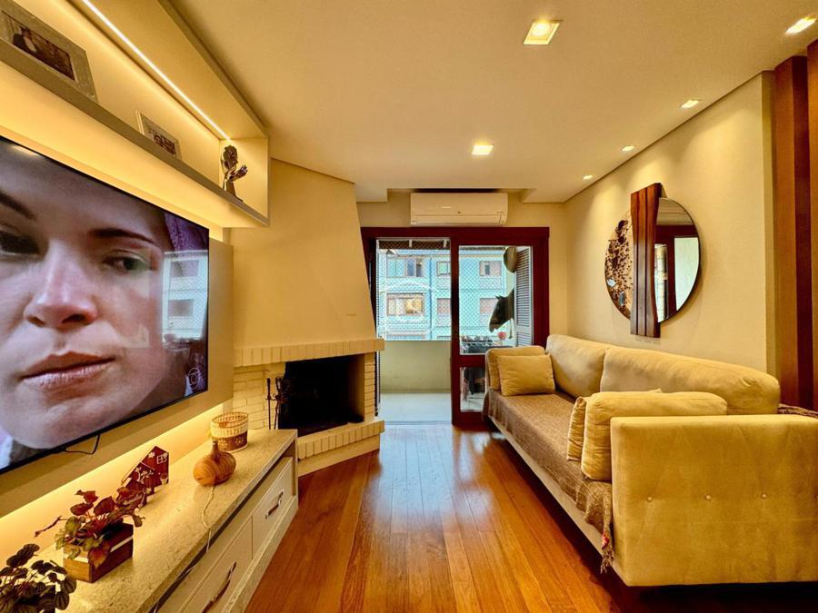 Apartamento distribuído em sala de estar com lareira e sacada.
