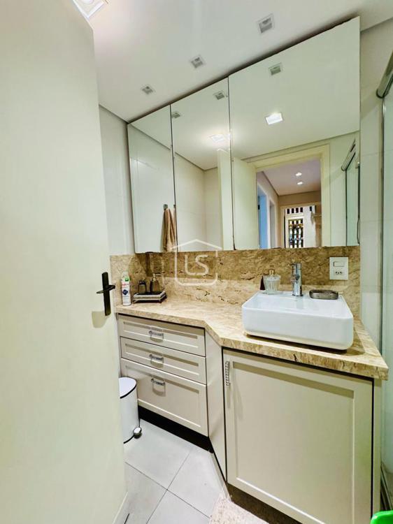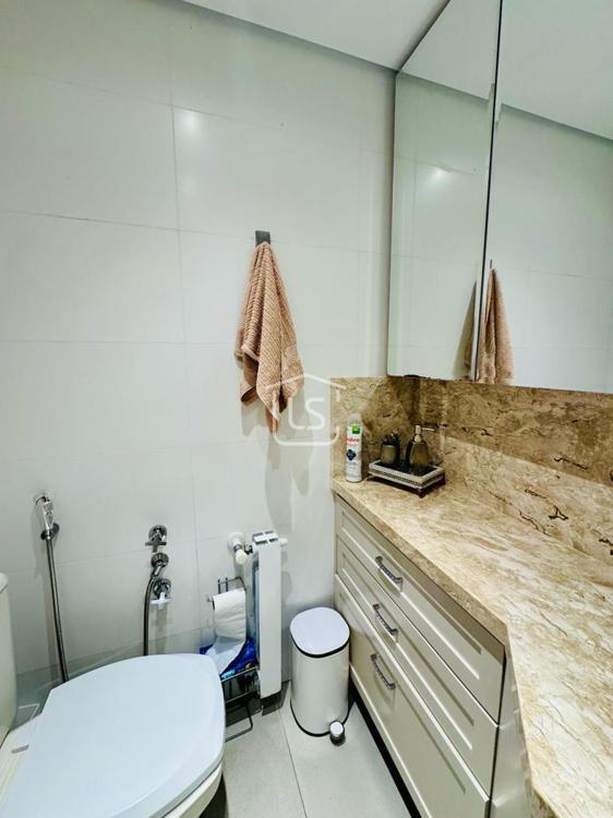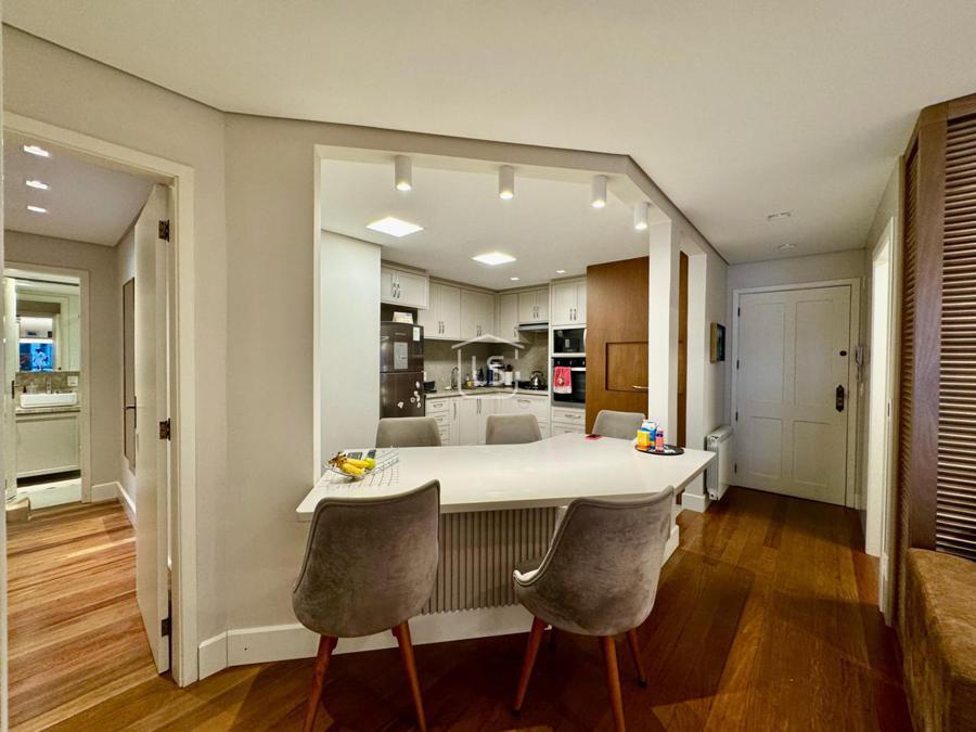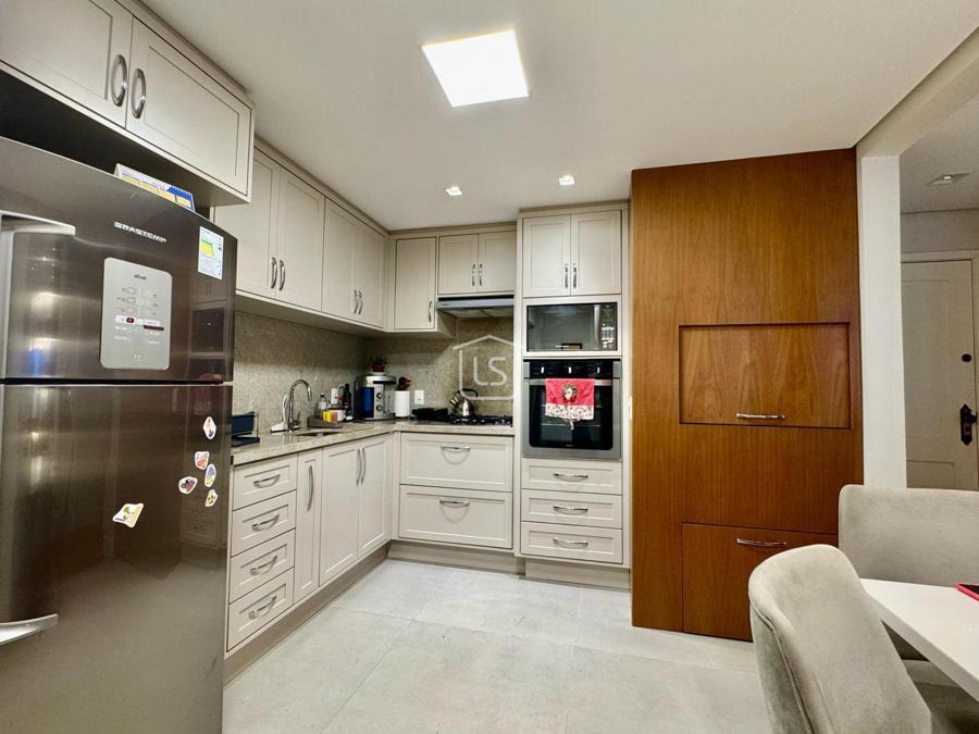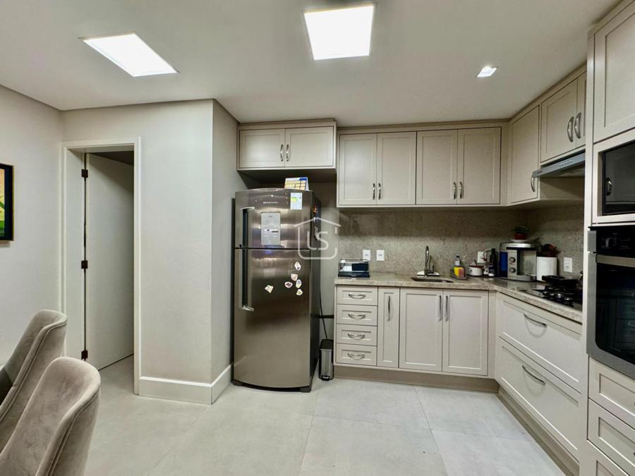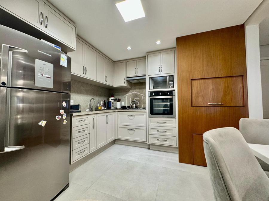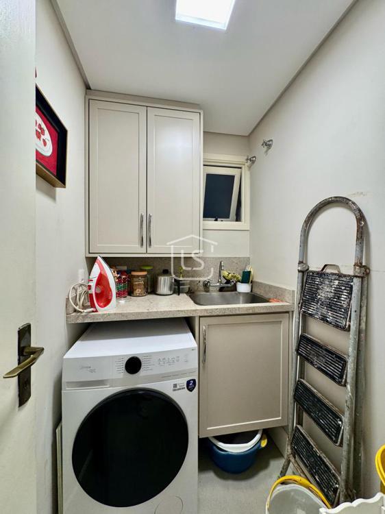 Cozinha com bancada e churrasqueira e lavanderia separada.