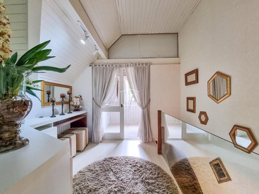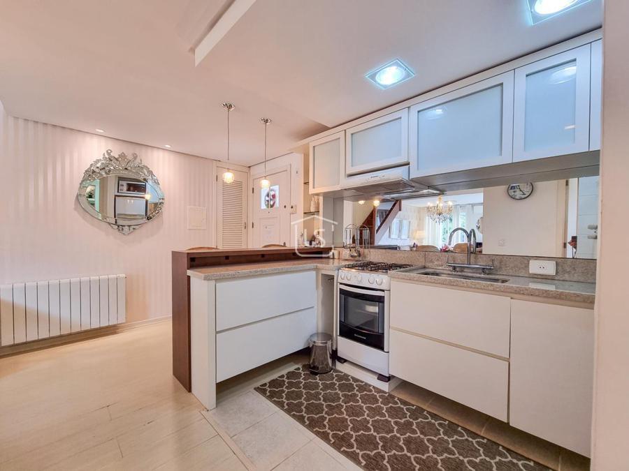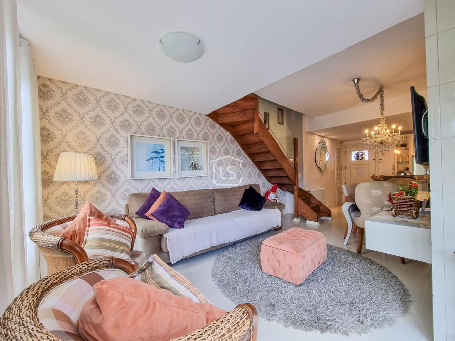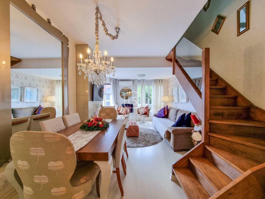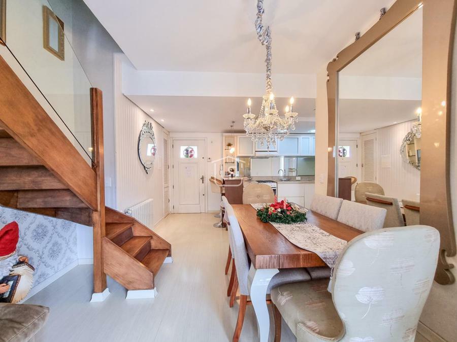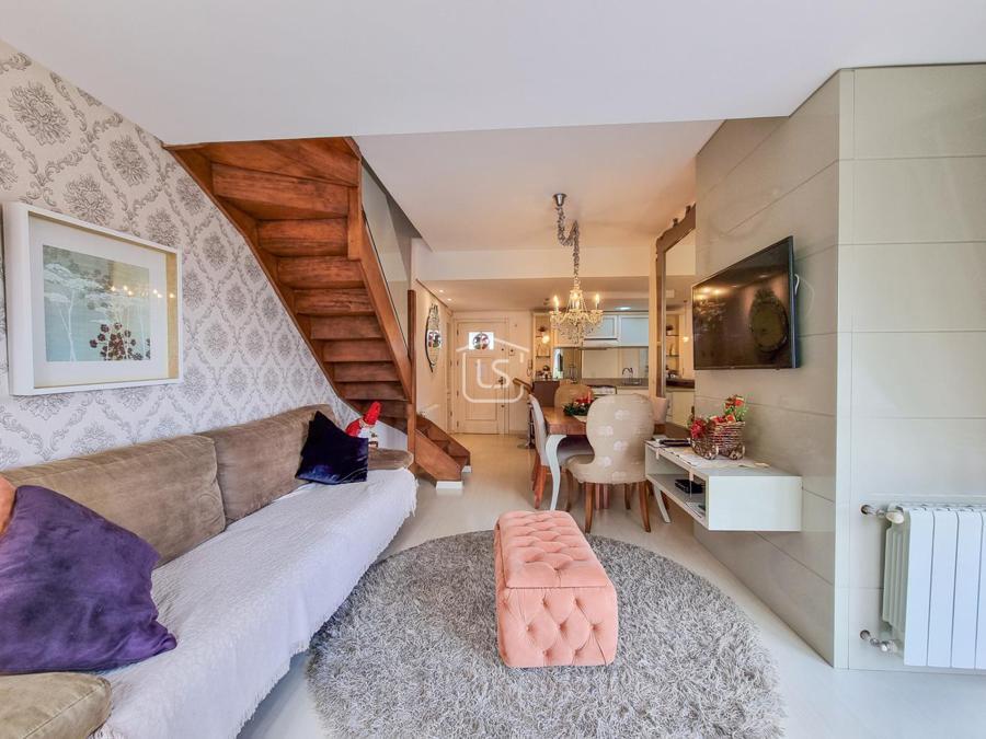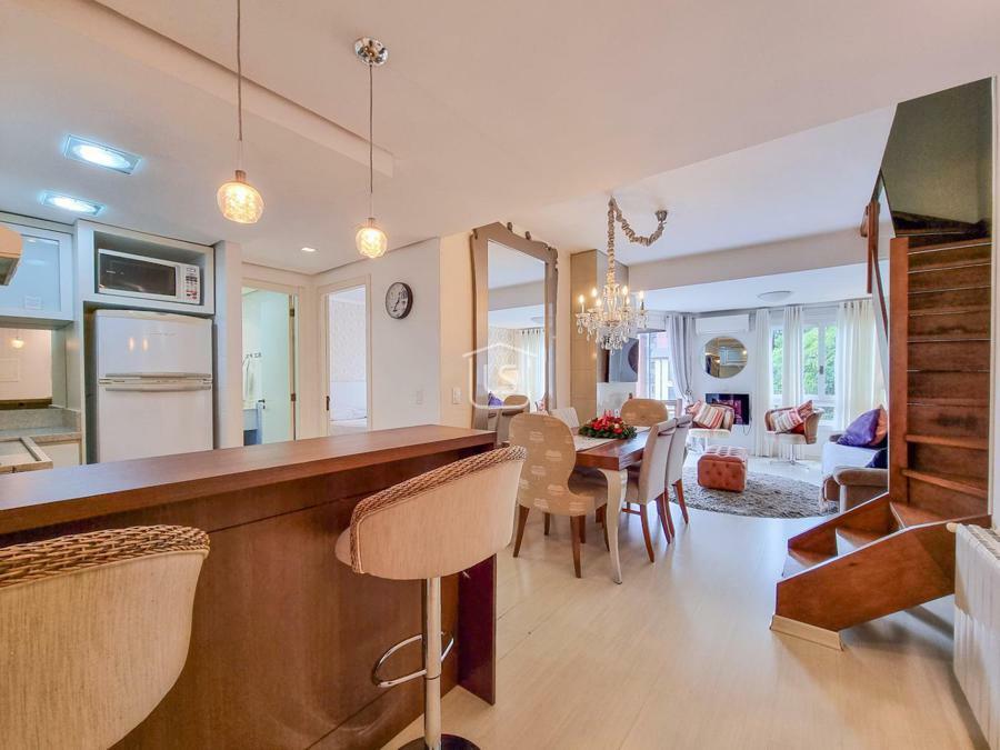 Distribuído em 3 dormitórios, um deles no térreo e outro suíte com closet. Living dois ambientes com lareira e sacada. Cozinha com bancada, banho social e vaga coberta de garagem.