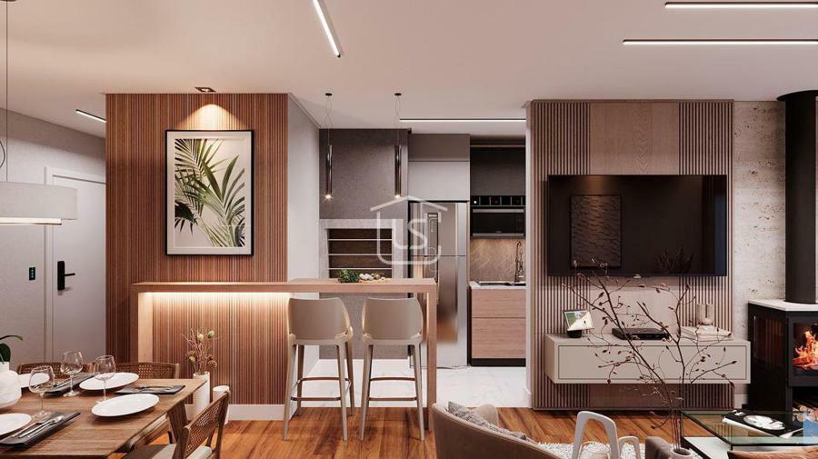 Cozinha americana com área de serviço integrada.
