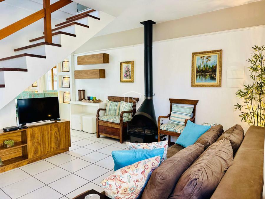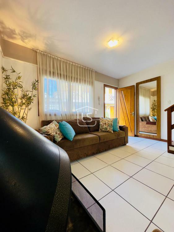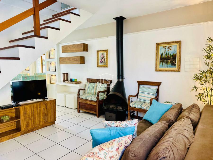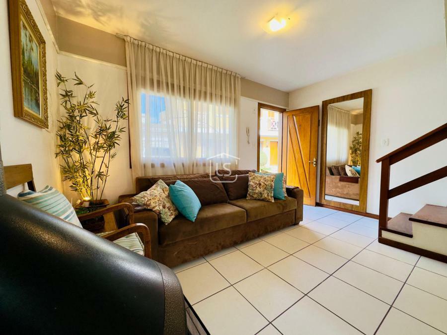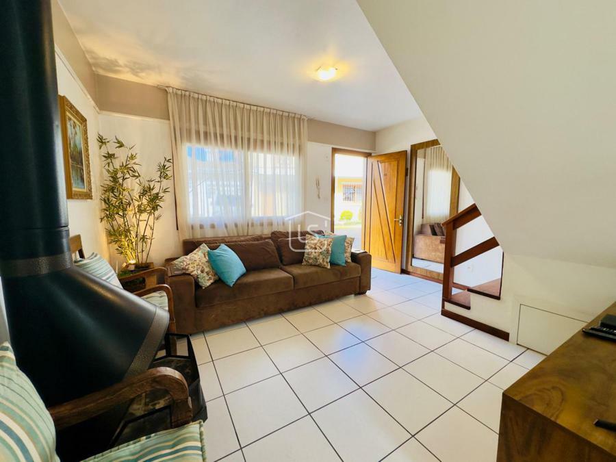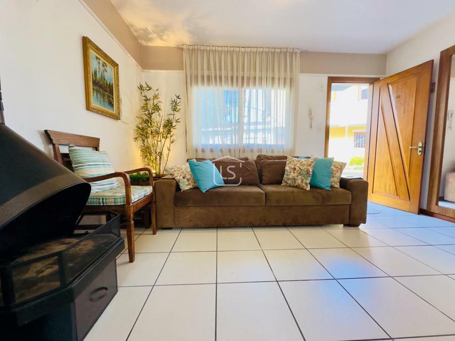 Residência em condomínio horizontal, mobiliada e equipada bem distribuída em 2 dormitórios, sendo um com sacada, banho social, living dois ambientes com lareira, cozinha integrada, área de serviço, Garagem fechada com solarium e churrasqueira, água quente instalada.