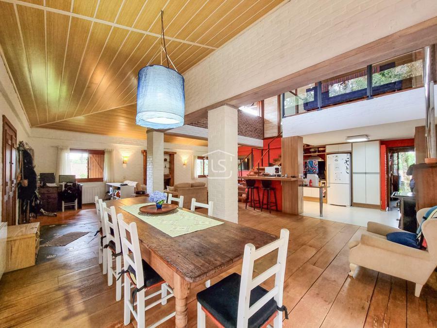 Espaço amplo da sala de estar com lareira chilena, sala de jantar e cozinha integradas. Uma ampla área de serviços, despensa e depósito para bicicletas, ferramentas etc.