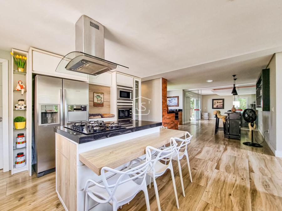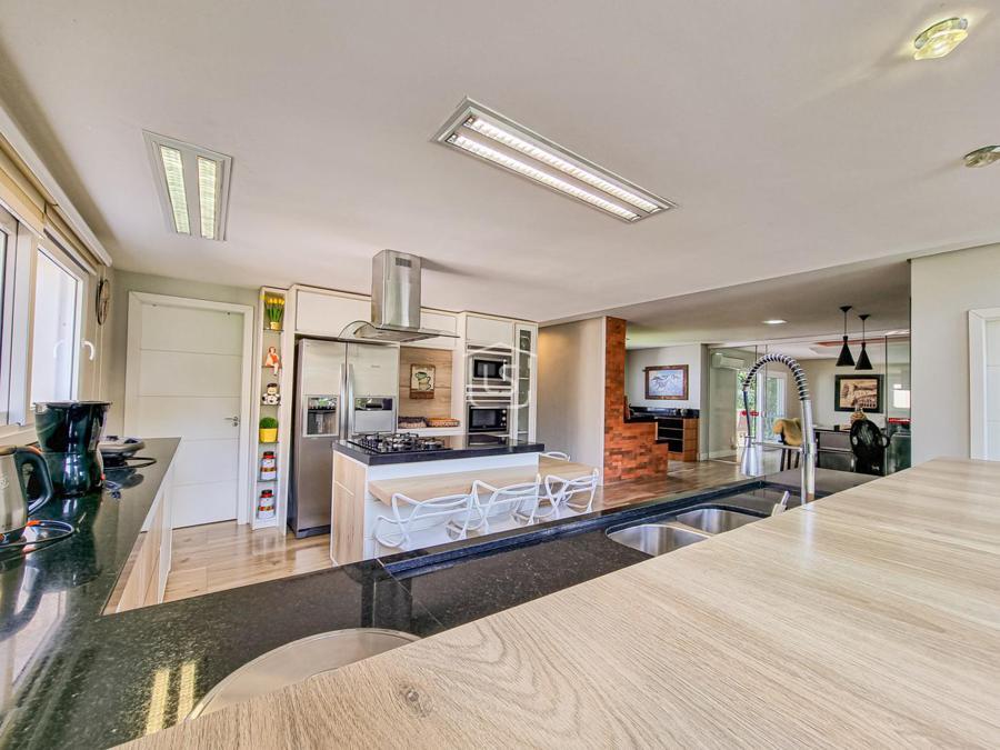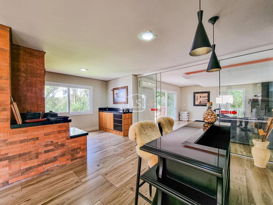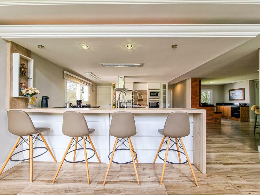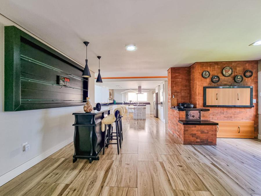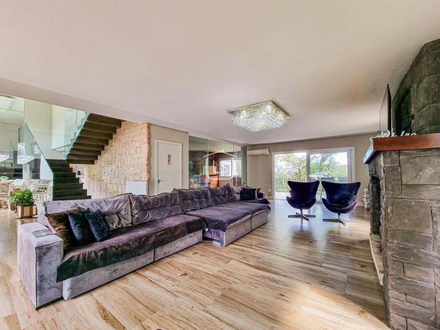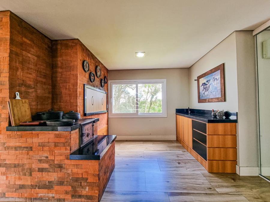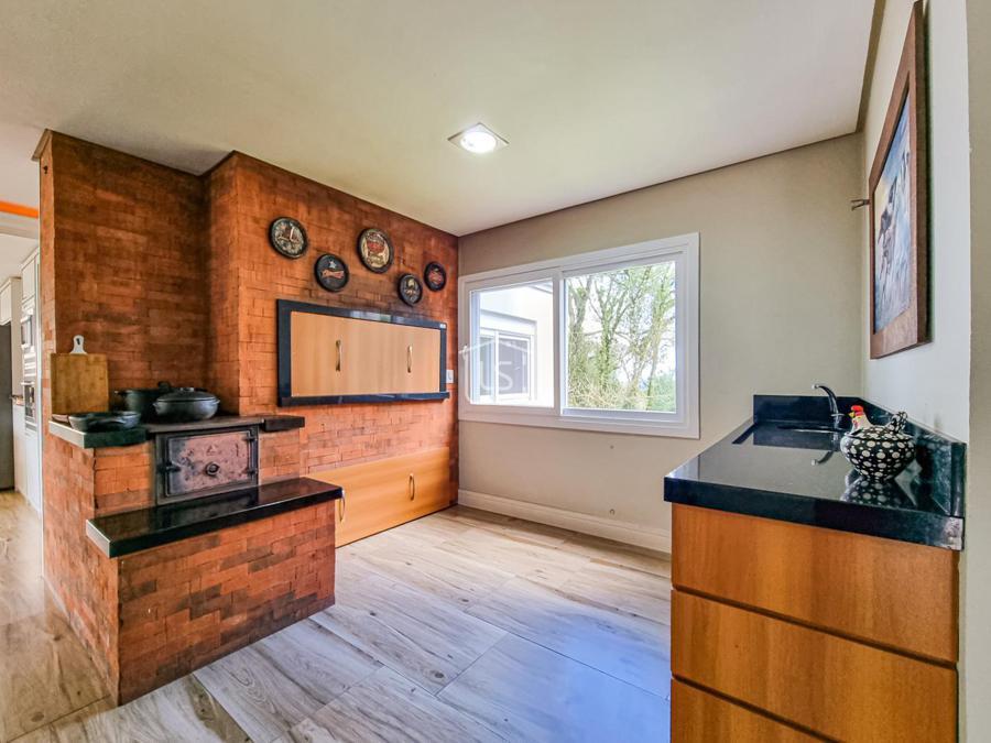 Sala de estar com lareira, sala de jantar, cozinha americana, espaço gourmet com churrasqueira e fogão campeiro. Lavabo e lavanderia separada.