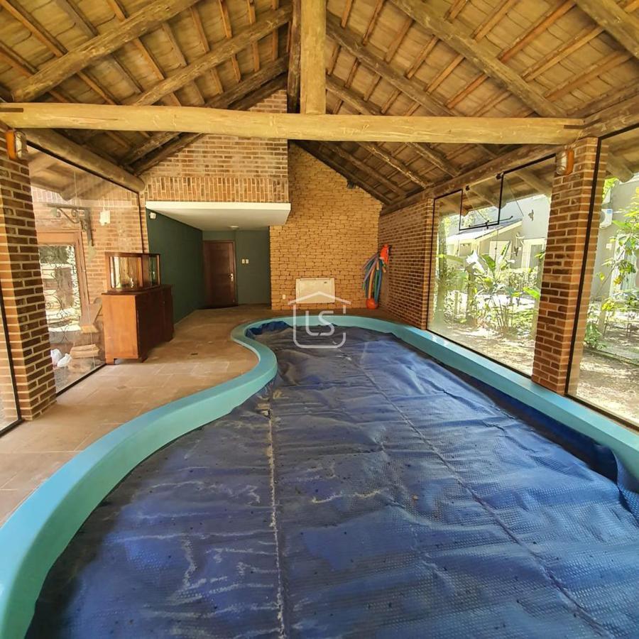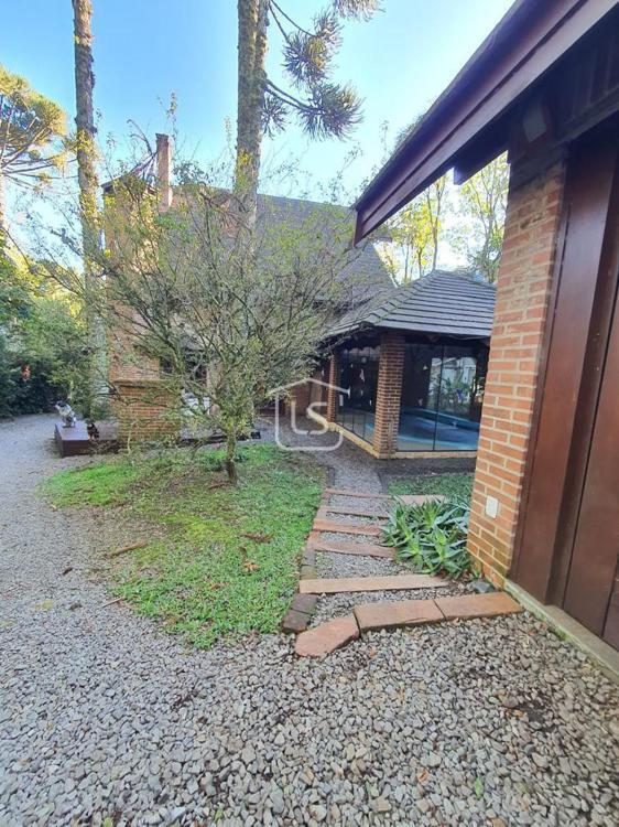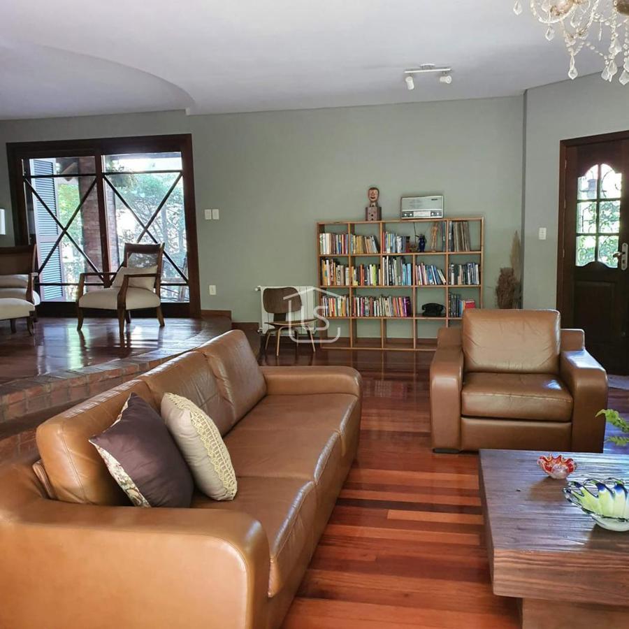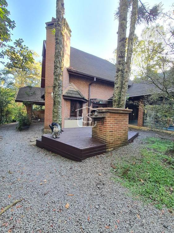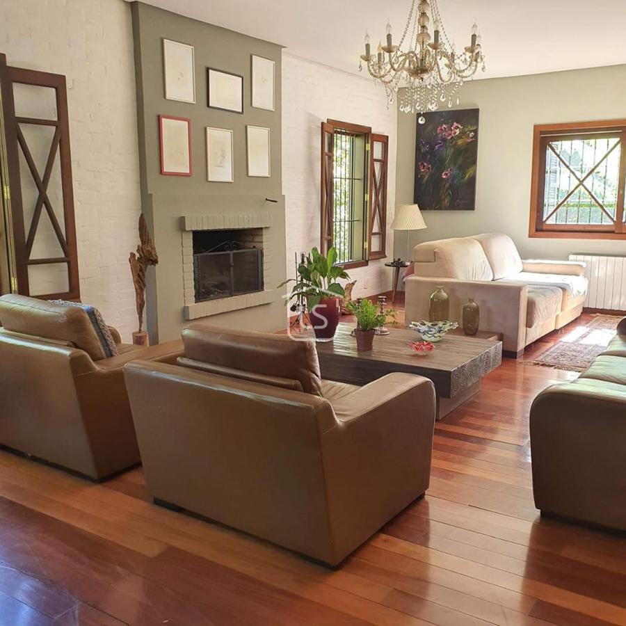 Distribuída em 4 dormitórios sendo 3 suítes, hall de entrada, sala de estar com lareira espanhola, sala de jantar, lavabo, cozinha com forno de pizza, churrasqueira e fogão campeiro. Lateral da casa envidraçada, espaço com piscina coberta aquecida.