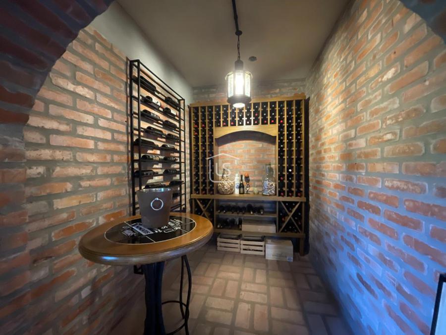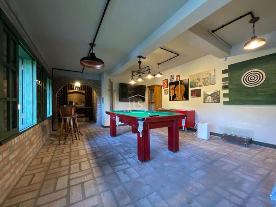 Sala de jogos com adega, cachoeira artificial e fogo de chão no pátio, depósito de lenha. Espera para elevador.